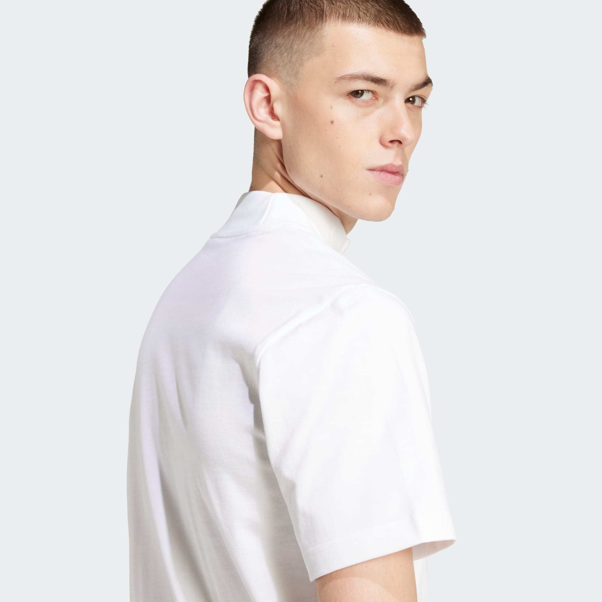 An adidas tee with a stand-up collar and sneakerhead graphic.