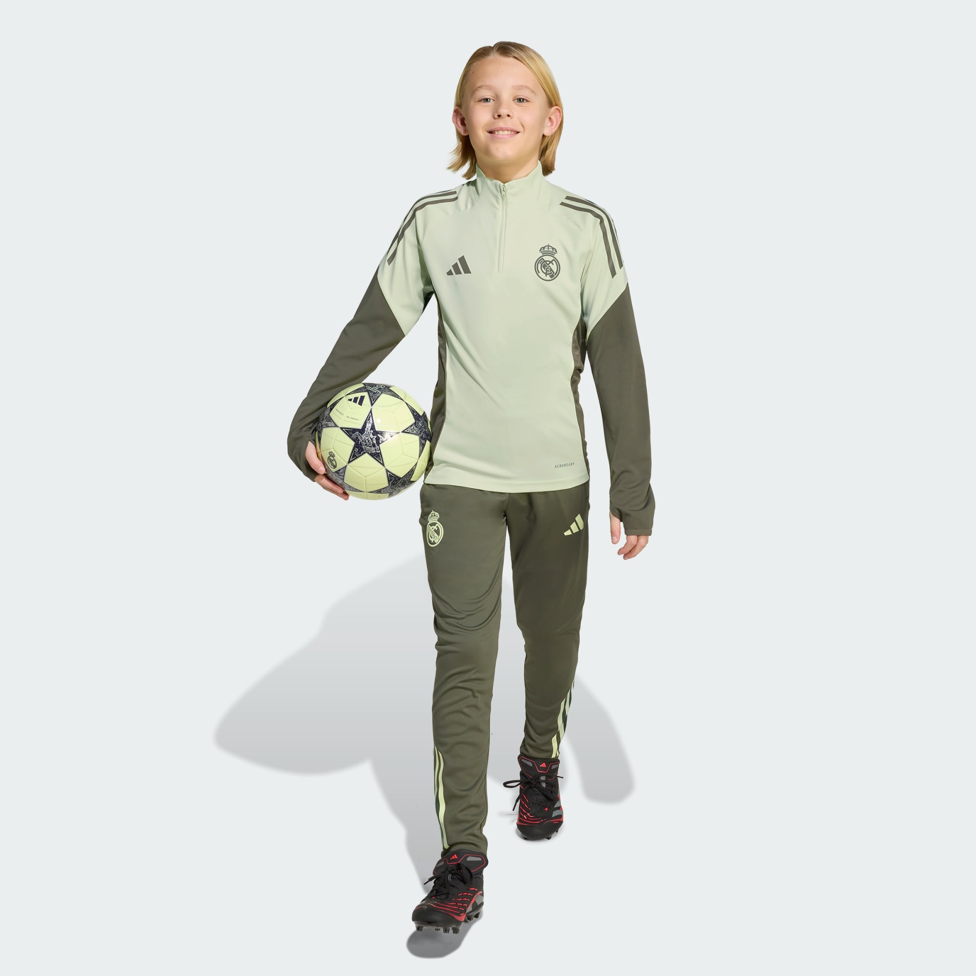 Bring your Real Madrid passion to the training ground. Part of the adidas kit the players wear before tackling league games, this juniors' football top offers slim-fitting coverage on chilly days. Moisture-managing AEROREADY works hard to keep you dry while your body warms up. A heat-applied club badge on the chest reminds you why you're out there.