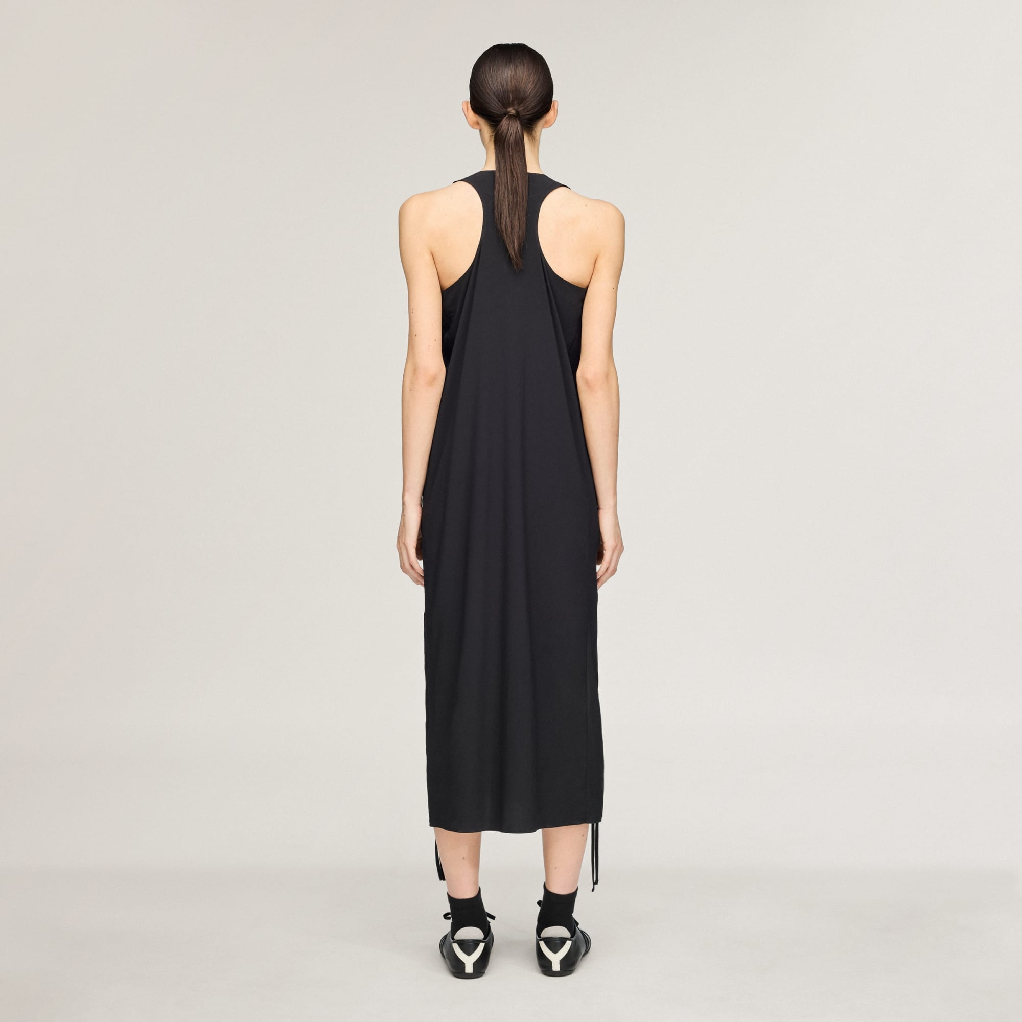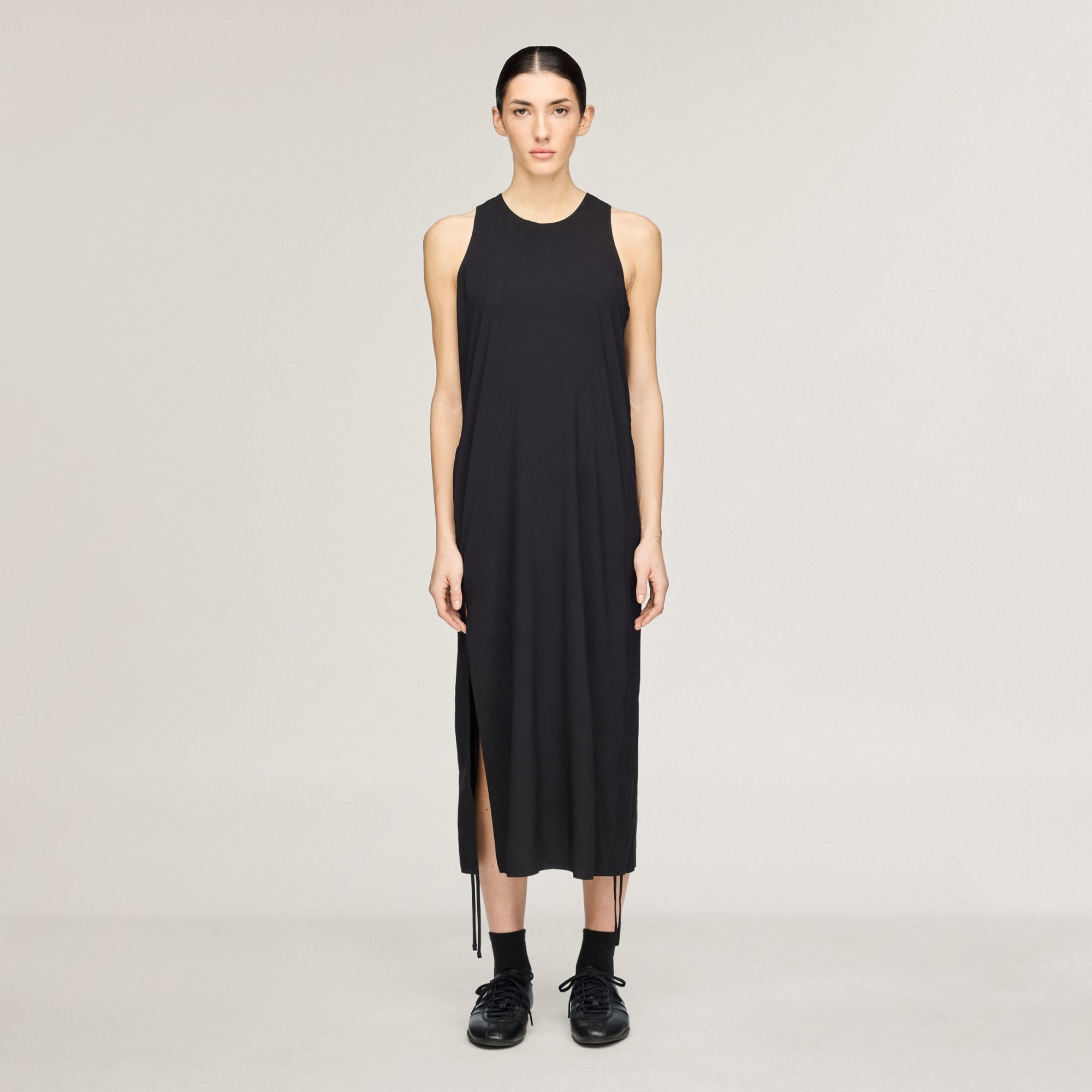 Une robe sans manches avec des liens pour resserrer la coupe.