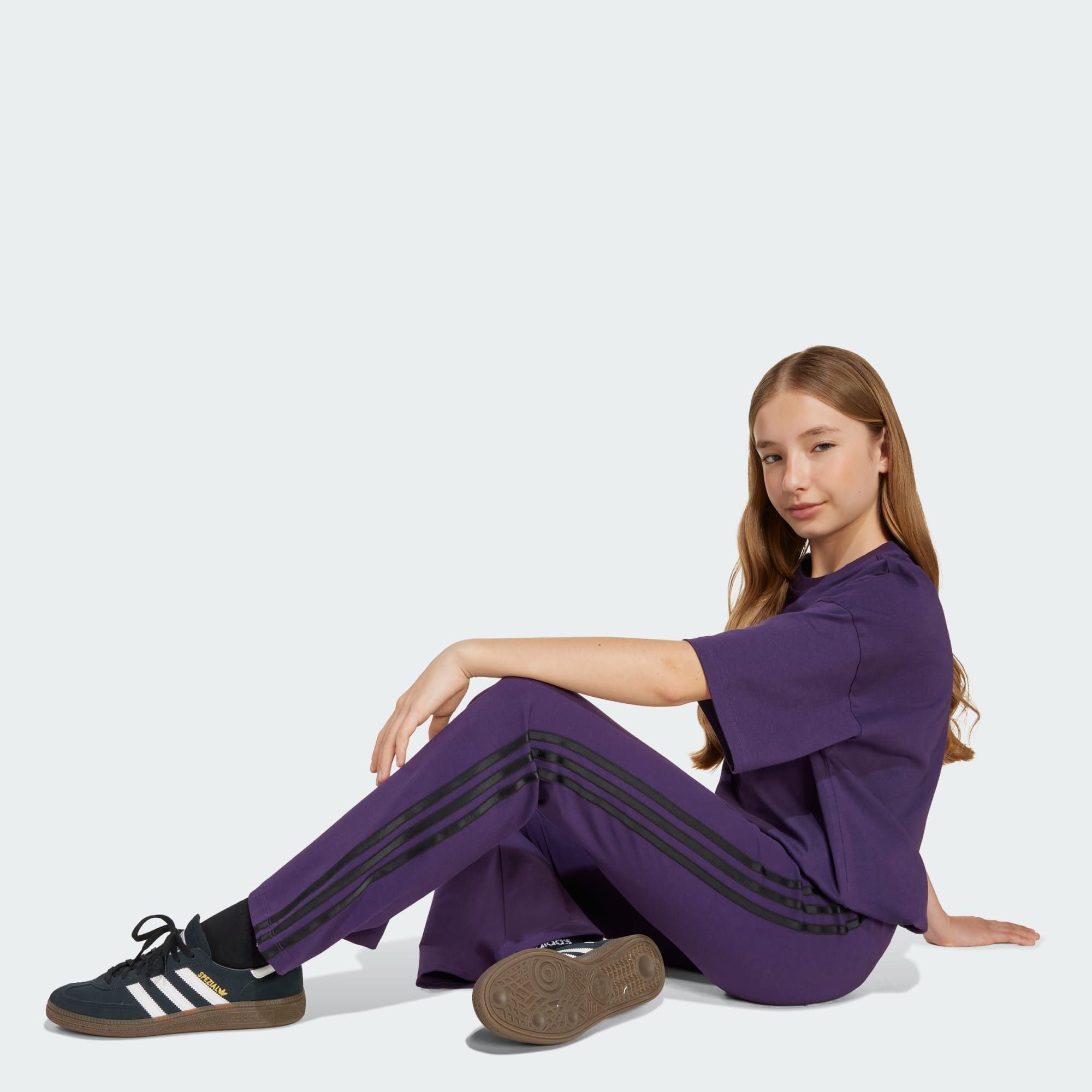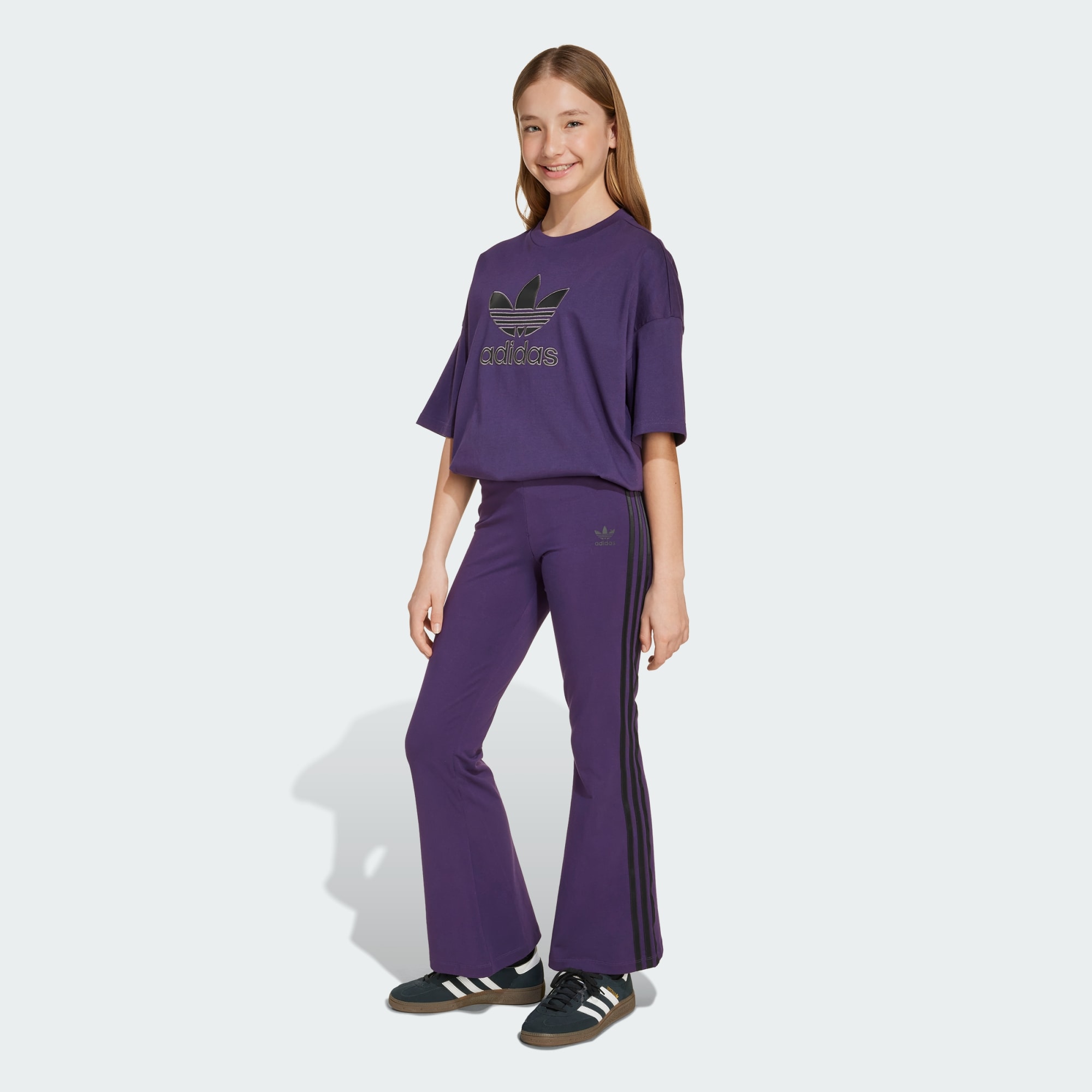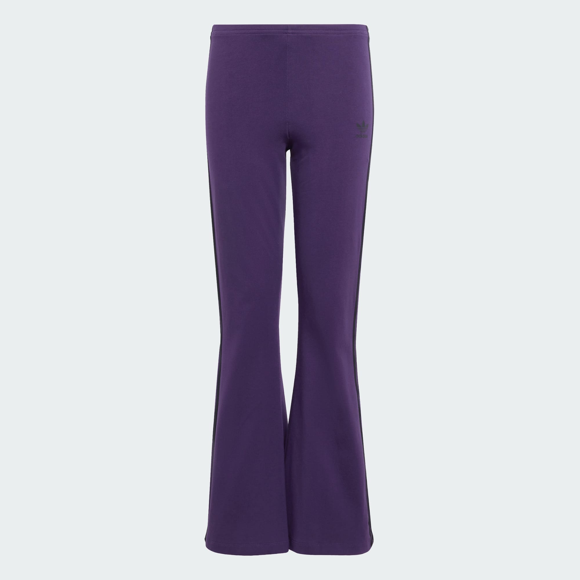 Hou 't casual en toch cool in deze junior legging. De zachte, stretchy stof van enkele jersey volgt de contouren van je lichaam en heeft wijd uitlopende pijpen voor een flatterende, comfortabele pasvorm. Langs beide pijpen lopen 3-Stripes in contrasterende kleuren, gecombineerd met een Trefoil-logo om de sportieve afkomst overduidelijk te maken.