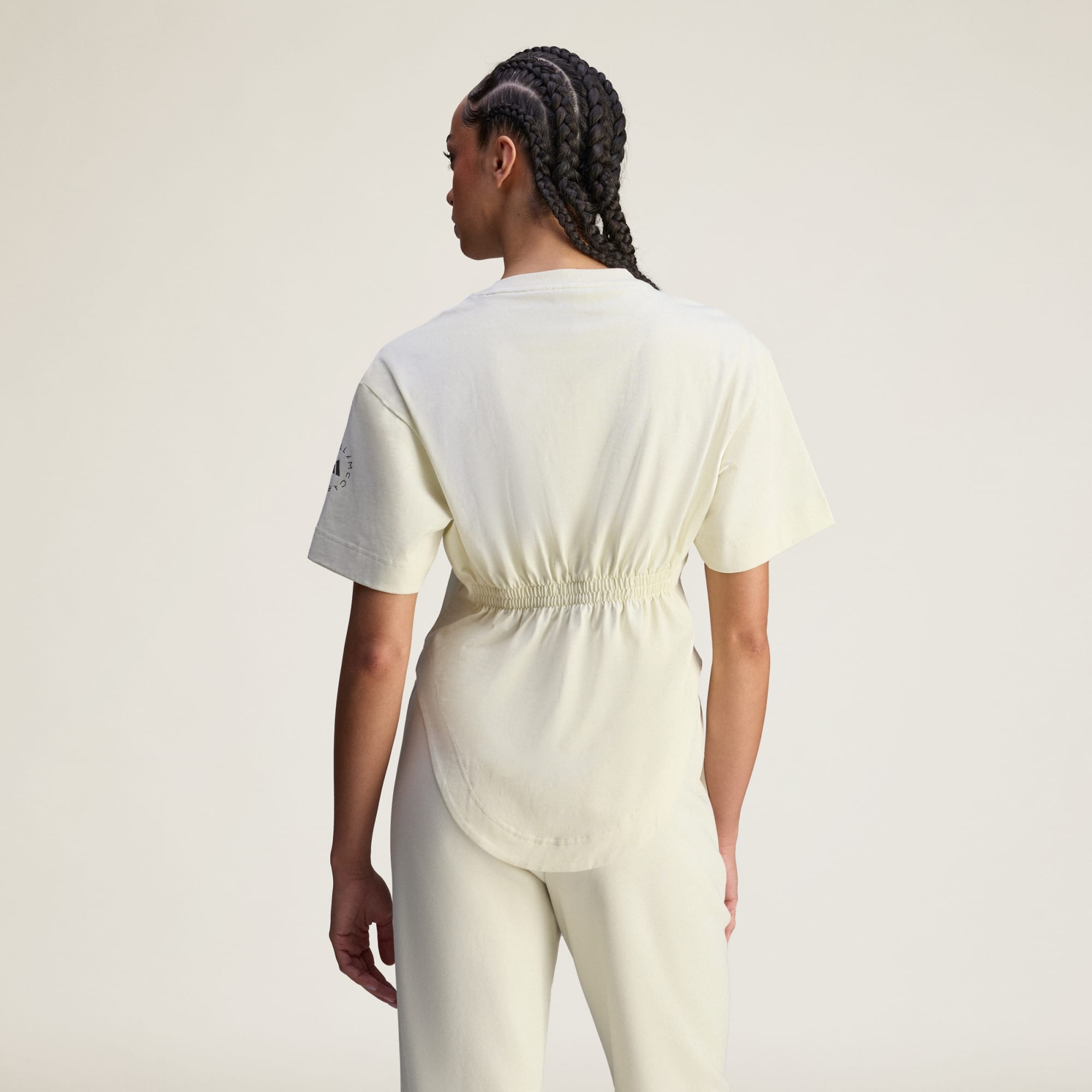 Het elastiek aan de achterkant van het T-shirt plooit het materiaal bij de taille samen voor een stijlvol silhouet.