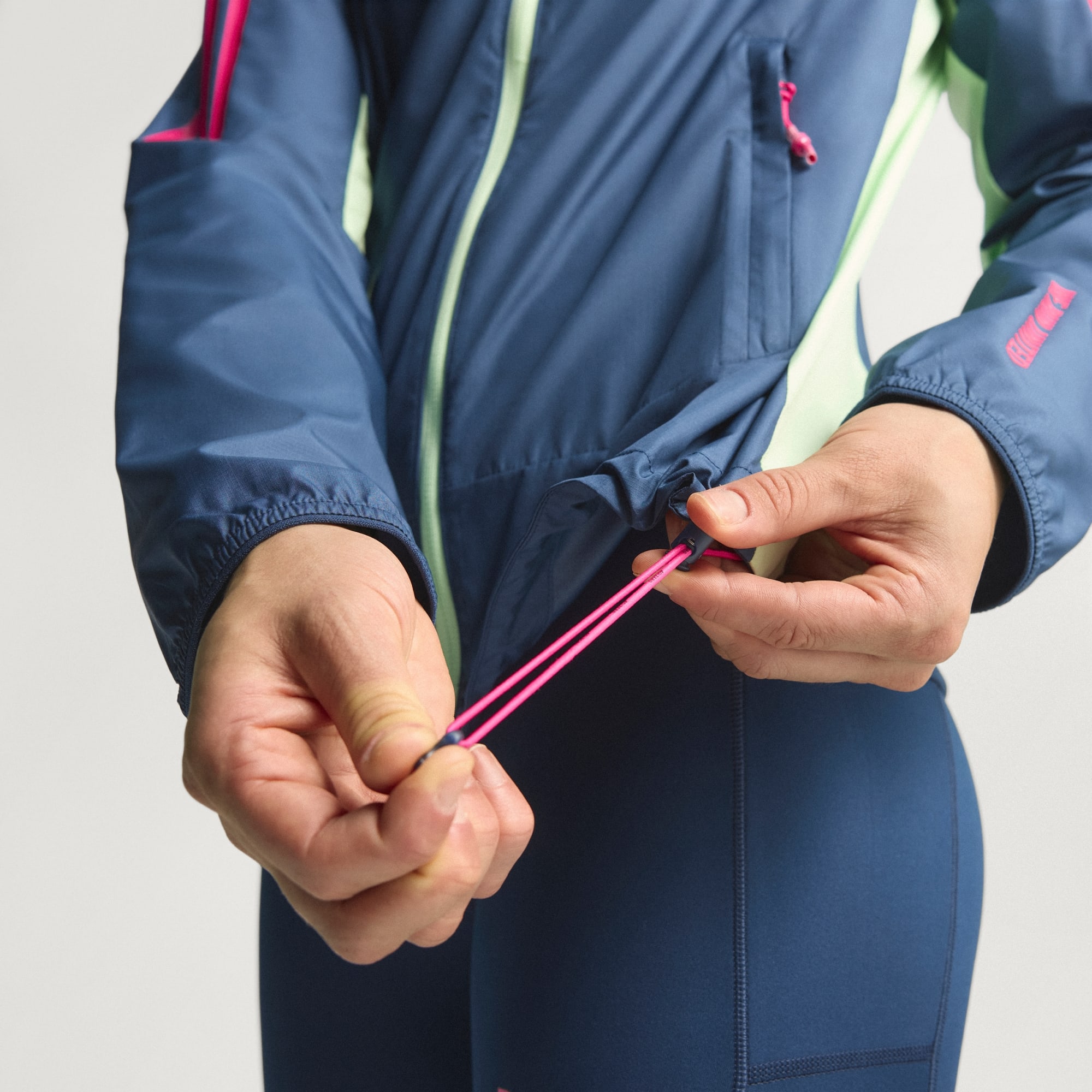 Mooi jackje, valt wel groot. Vooral bij de mouwen/pols, maar het voordeel is dat je wel bij je horloge kunt. Heeft onderaan 2 aantrekkoordjes zodat het beter aansluit. Tevens 2 handige ritszakken en binnenin een naamlabel. Je kunt het ook klein opvouwen in een van de zakken.