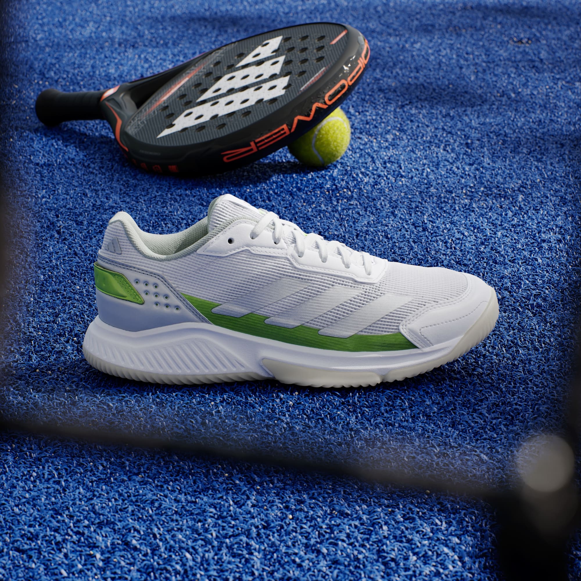 Om te kunnen domineren op de padelbaan moet je razendsnel zijn. Daarom combineren deze adidas Courtquick schoenen een lichtgewicht bovenwerk van textiel met een stabiliserende Slingframe-constructie om wendingen en snelle overgangen te ondersteunen. Een flexibele Cloudfoam Plus-middenzool garandeert dat je altijd je beste beentje voor kunt zetten. Dit product bestaat voor minstens 20% uit gerecyclede materialen. Door hergebruik van materialen die al eerder zijn gecreëerd, helpen we afval verminderen, en ook onze afhankelijkheid van beperkt beschikbare grondstoffen. Daarnaast verkleint het de voetafdruk van onze producten.