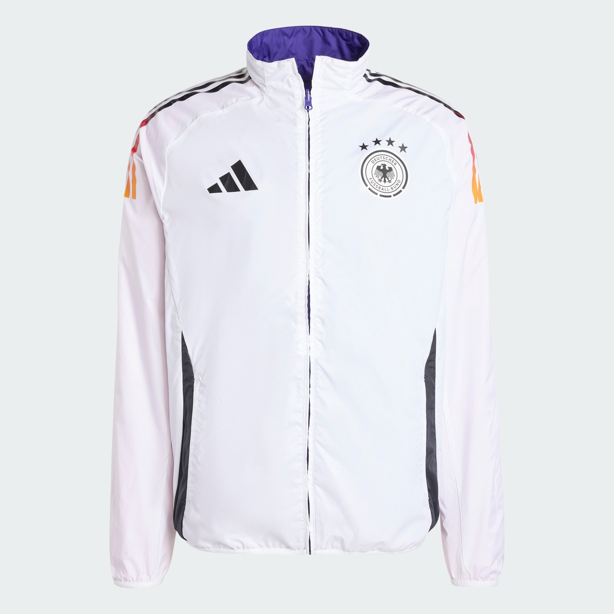 Laat met dit adidas Duitsland jack zien hoe trots je bent op het nationale elftal. Of het team nu thuis speelt of uit, met dit dubbelzijdige voetbalritsjack volg je ze in een look die perfect aansluit op het tenue dat de spelers dragen. Op de borst prijkt een embleem van de voetbalbond, en robuust ripstop materiaal houdt de elementen op afstand, zodat jij je alleen nog maar op het aanmoedigen hoeft te concentreren. Dit product is gemaakt met 100% gerecyclede materialen. Door hergebruik van materialen die al eerder zijn gecreëerd, helpen we afval verminderen, en ook onze afhankelijkheid van beperkt beschikbare grondstoffen. Daarnaast verkleint het de voetafdruk van onze producten.
