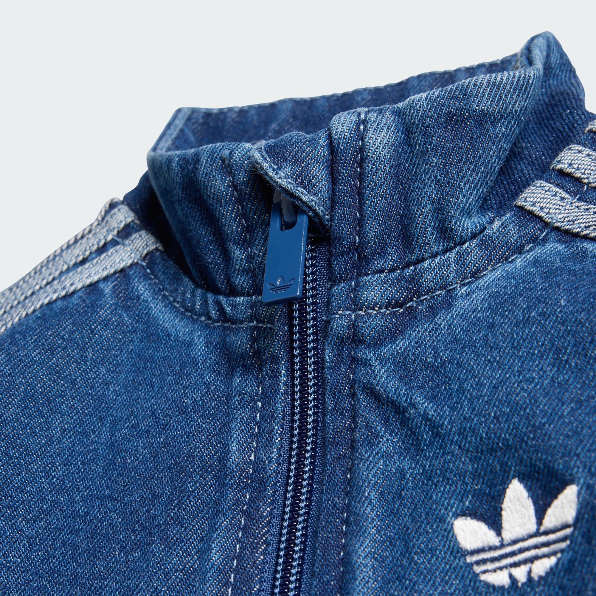 Een denim jack met geborduurd Trefoil-logo voor klassiek design met een authentieke attitude.