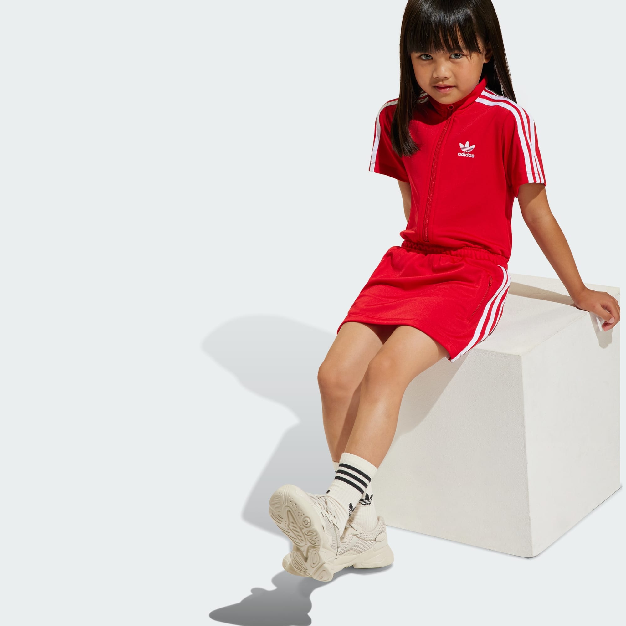 Een adidas Firebird kinderjurk die is gemaakt met gerecycled materiaal.