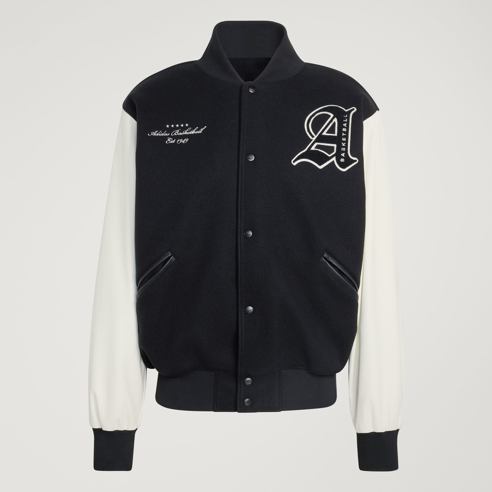 Een jack met collegiate-stijl en basketbaldetails die laten zien dat je fan bent.