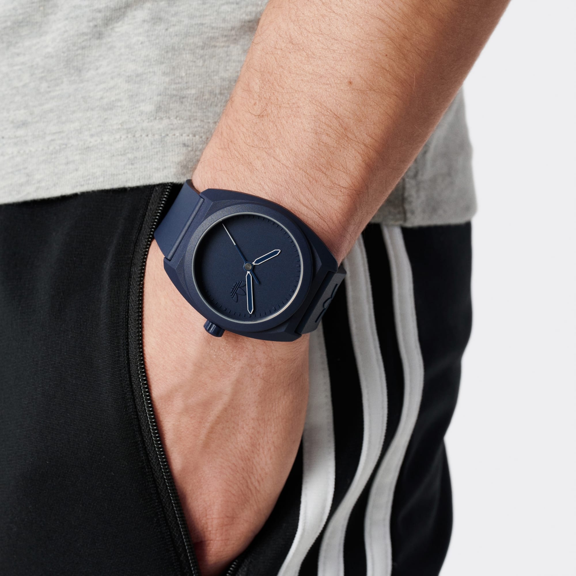 - Donkerblauwe kast, wijzerplaat en band