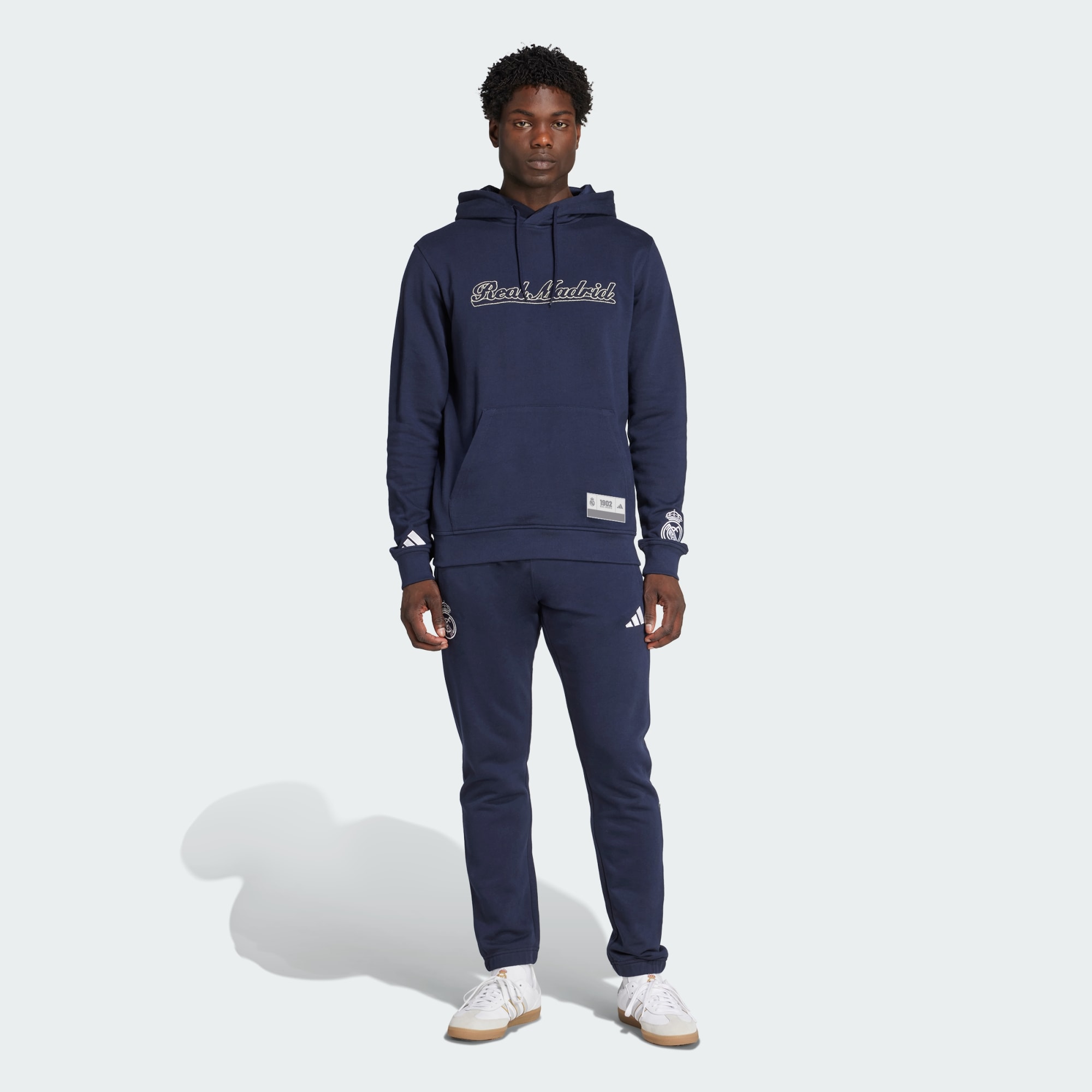 Zachte Real Madrid broek met details geïnspireerd op Amerikaanse sporten.