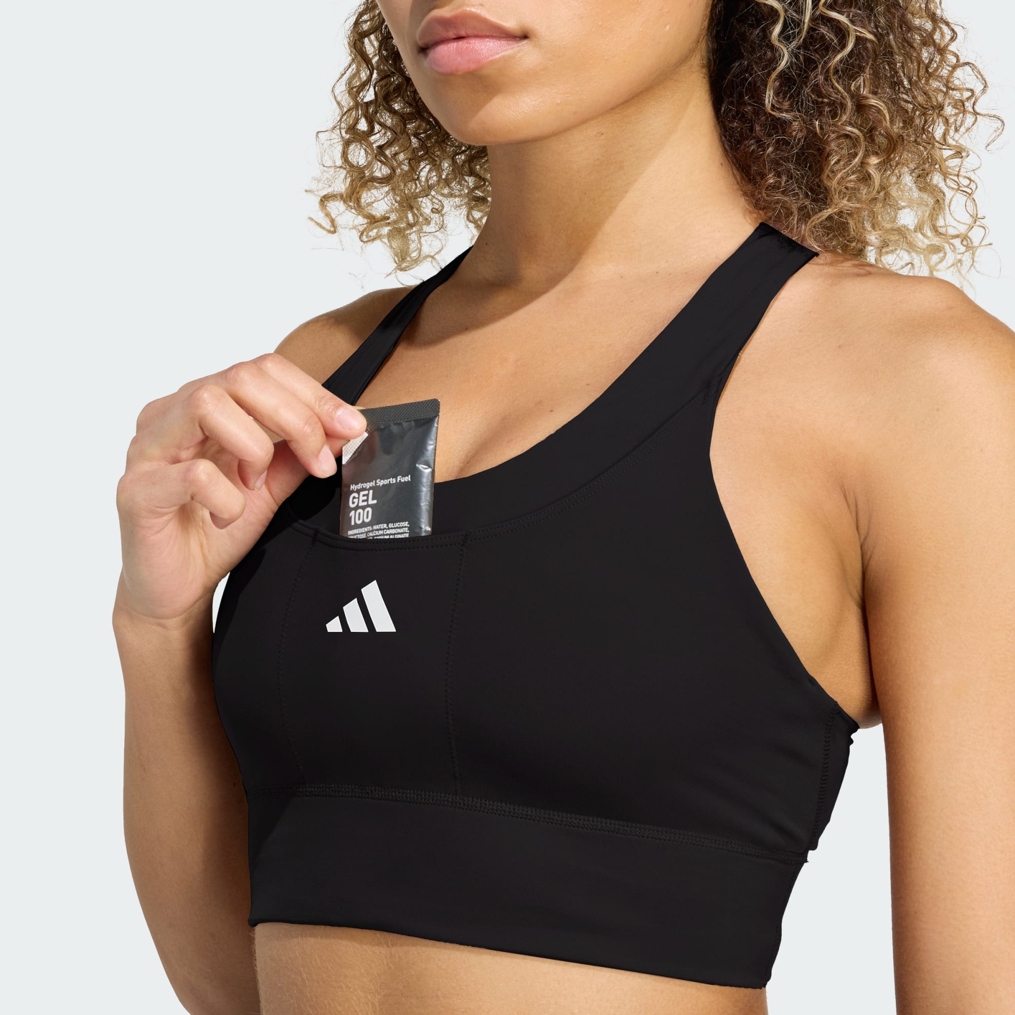 Een sportbeha met CLIMACOOL om je koel, droog en voorbereid te houden, deels gemaakt met gerecycled materiaal.