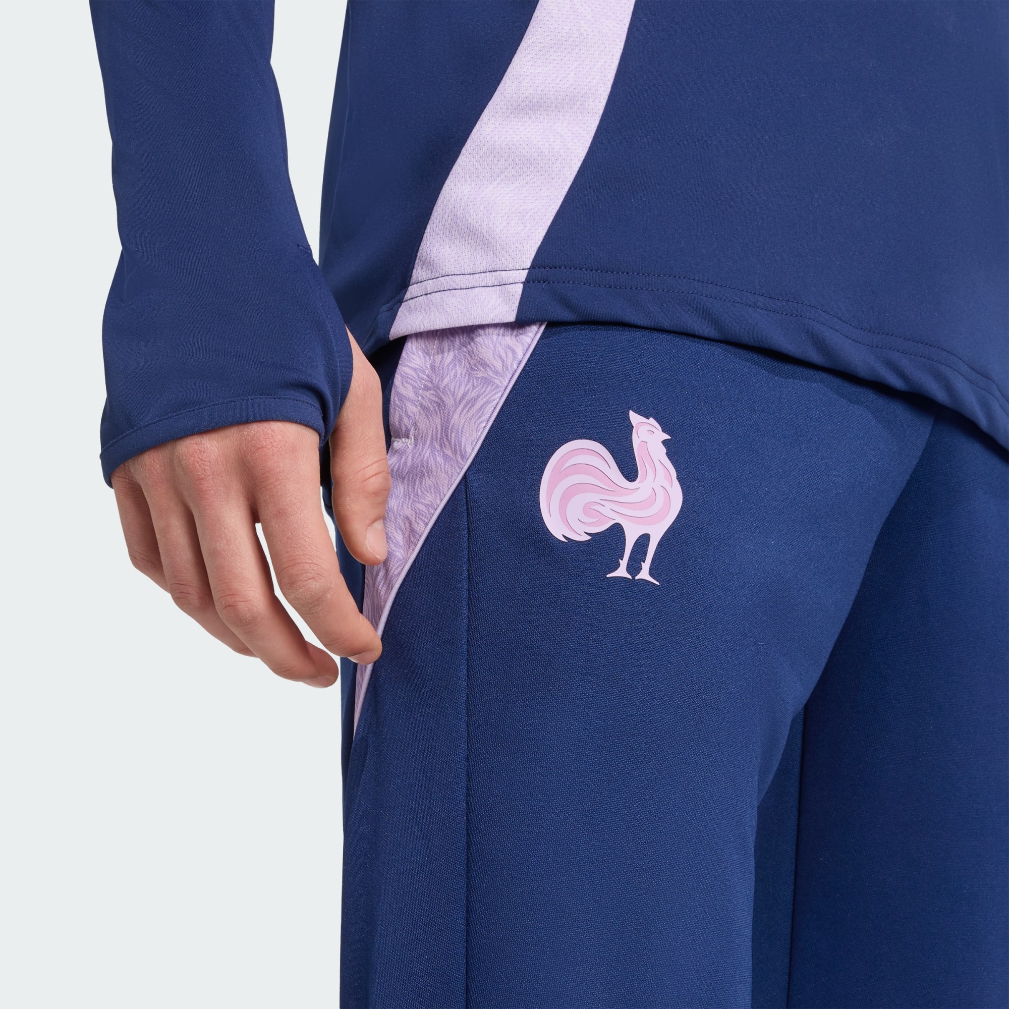 Zet elke sessie een topprestatie neer in deze adidas Frankrijk trainingsbroek voor rugby. De dubbelgebreide stof voelt zacht op je huid en is rekbaar voor maximale bewegingsvrijheid, zodat je niet wordt afgeleid. Op het been staat de trotse Gallische haan, tegen een frisse lavendelkleurige achtergrond.