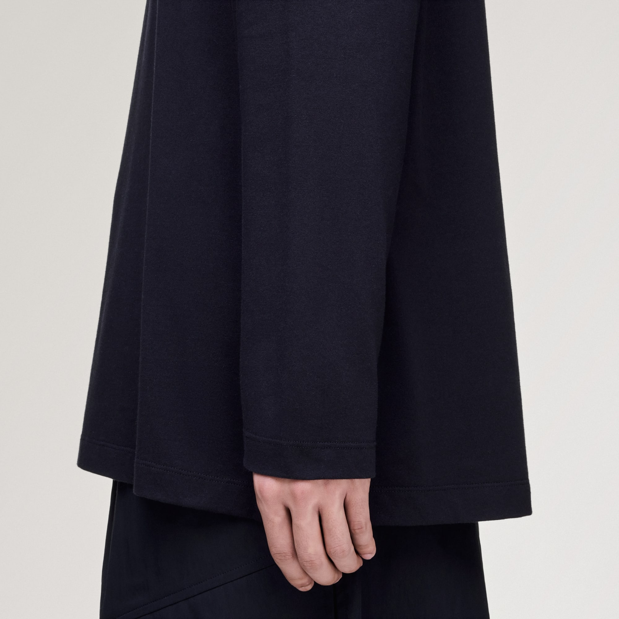 De enkele jersey zorgt voor een zacht, comfortabel gevoel, terwijl de losse pasvorm en lange mouwen een elegant silhouet creëren.